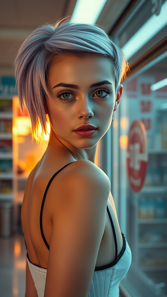 A portrait of an exceptionally stylish and beautiful girl in a futuristic convenience store, showcasing a unique asymmetric haircut with a distinct cyberpunk aesthetic. Her features exhibit a striking, ethereal beauty, captured in stunning detail at 8k resolution with a 50mm lens and f/1.4 aperture for sharp focus. The image captures a cowboy shot, highlighting her perfect anatomy with her arms elegantly placed behind her back. The warm glow of sunset streams through the window, casting a golden hue on her face. The scene is set with soft, diffused sunlight enriching the atmosphere, creating a mesmerizing blend of futuristic and natural elements, all with a high level of detail and attention to composition.