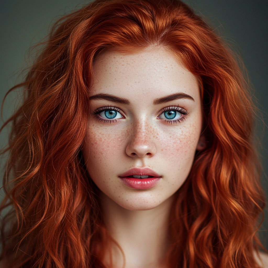 A portrait of an exquisitely beautiful pale-skinned 25-year-old with striking blue eyes and a scattering of freckles, full, wide lips, and a mane of tousled, curly red hair, created in a graphic manhwa art style. The image should be rendered in 8K high quality, UHD, and HDR, employing the model Dark Sushi with a 2.5D artistic approach. Emphasize symmetry and natural beauty, avoiding any elements of duplication, disfigurement, mutation, deformation, cloning, or abnormal facial features. Steer clear of low resolution, blurriness, jpeg artifacts, or any form of watermarking, logos, or textual distractions. Maintain visual clarity and quality, ensuring the composition remains intact and focused.