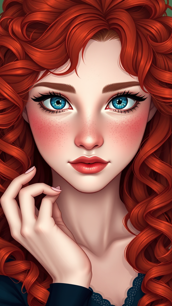 A portrait of an extraordinarily beautiful 25-year-old Merida with pale skin, mesmerizing blue eyes, and charming freckles. She has full, wide lips and stunningly messy, curly red hair, presented in a graphic manhwa art style. The image is rendered in stunning 8k high quality, UHD, HDR, and 8K resolution. It embodies a sophisticated and elegant model demeanor inspired by Dark Sushi with a 2.5D effect. The artwork avoids duplication, disfigurement, mutation, or deformity, ensuring features are harmonious and well-proportioned. Her eyes are captivating and symmetrical, with a graceful neck and perfectly formed hands. There is no presence of low resolution, out of frame elements, blurriness, jpeg artifacts, watermarks, logos, letters, usernames, words, cropping flaws, cartoonish elements, split images, or poorly drawn aspects, ensuring a seamless and flawless artistic portrayal.