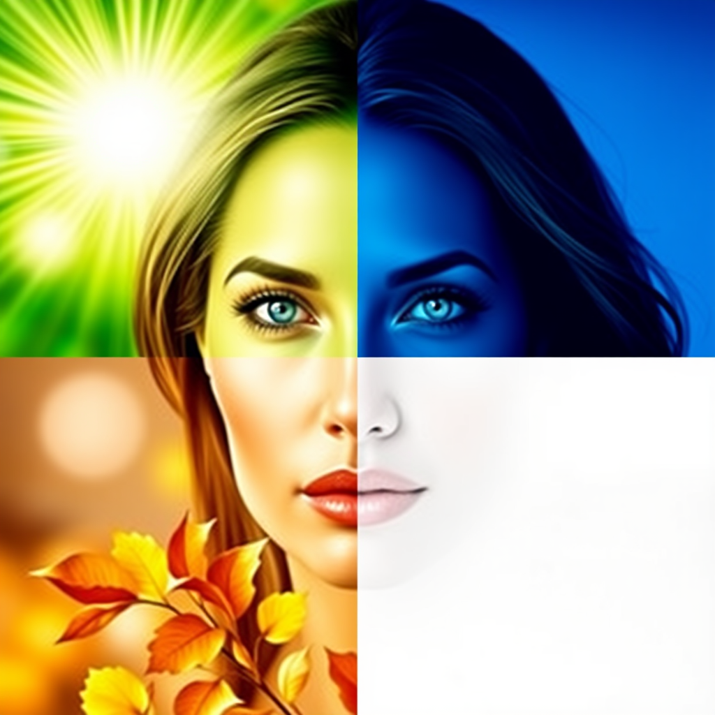 A portrait of Angelina Jolie's face is artfully divided into four distinct squares, each representing a season. The top left square radiates with the vibrant green of spring, symbolizing renewal and fresh beginnings. The top right square captures the essence of summer with a deep, serene blue, evoking the heat and tranquility of long sunny days. In the bottom left, autumn is depicted in warm shades of yellow and orange, with the delicate touch of leaves gently drifting away. The bottom right square transitions into the pure, crisp white of winter, where soft snowflakes can be seen lightly falling against a cool backdrop.