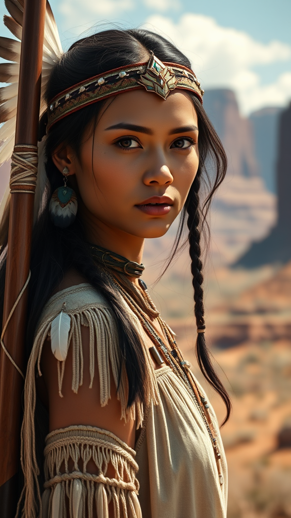 A portrait of Madison Beer reimagined as a modern-day Pocahontas, a young, stunning Native American woman with a perfectly symmetrical face. She wears intricate feather jewelry and a traditional handmade dress, embodying the strength of an armed female hunter and warrior. The scene is set against the rugged beauty of a Utah landscape, captured in an ultra-realistic style. This concept art draws inspiration from the works of Artgerm, Greg Rutkowski, and Alphonse Mucha, featuring elegant details, a captivating depth of field, and rendered in 8k resolution.