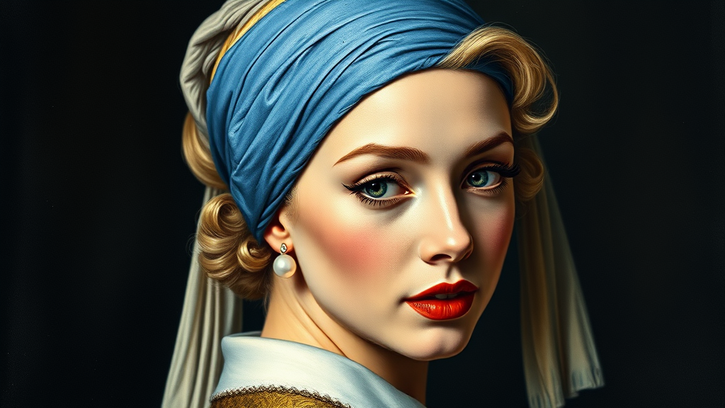 A portrait of Marilyn Monroe styled in the manner of The Girl with a Pearl Earring, featuring Monroe with her iconic blonde curls wrapped in a delicate blue turban and wearing a single luminous pearl earring, her expression soft and enigmatic against a dark, timeless background.