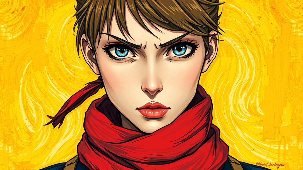 A portrait of Mikasa Ackerman, capturing an intense and aggressive expression, illustrated in the distinctive style of Vincent van Gogh with swirling, textured brush strokes. Emphasizing extreme detail, Mikasa is depicted with her signature red scarf wrapped around her neck. Her anime features are harmoniously blended with Van Gogh's impressionistic touch, set against a vibrant yellow background that amplifies the dynamic energy of the piece. Subtle creative enhancements are made while preserving the essence, such as adding small flecks of deep blue to her eyes to create a striking contrast and incorporating gentle dashes of orange to the scarf for added depth and warmth.