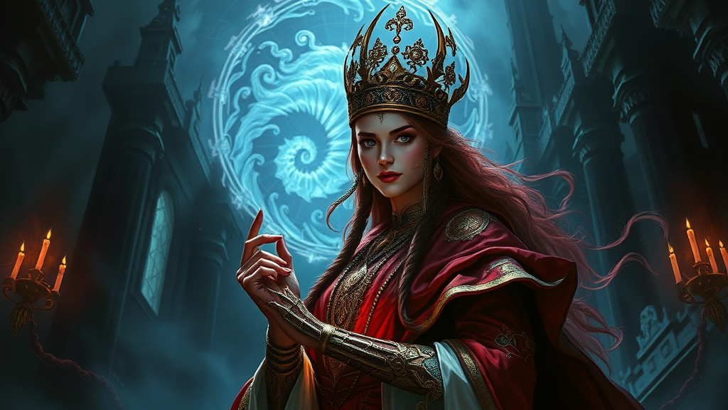 A portrait of mystical royalty exuding a vibrant contrast set against the backdrop of a spiraling ghostly presence within a towering dark castle. The scene is infused with the rich complexity reminiscent of Magic the Gathering, capturing a gorgeous pose enveloped in dramatic shadows. Orthodox symbolism weaves through the composition, accompanied by ambient occlusion and a deeply emotional undertone. Tribal dark fantasy elements blend seamlessly with intricate, ominous details, conjuring an atmosphere of enchanting mystique and compelling allure.
