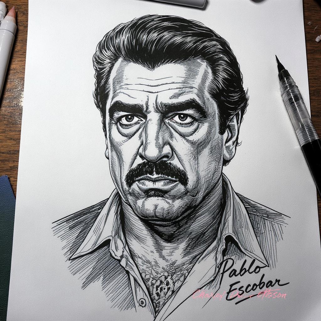 A portrait of Pablo Escobar sketch drawn on paper, centered, with intricate and highly detailed linework that captures breathtaking beauty. The artwork reflects a precise line art style with vibrant, comprehensive cinematic elements reminiscent of Charles Dana Gibson's style. It's created in 8k resolution with hdr effects, capturing a vice city vibe with lowres charm. The piece may include text, errors, missing or extra digits, cropped elements, and jpeg artifacts. It features a signature with elements of bad anatomy like extra or fewer limbs, malformed hands or feet, and disfigured, out-of-frame sections. Despite potential for tiling, deformed or mutated appearance, the portrait maintains a fascinating blend of blurry, fuzzy qualities and misshaped aspects, invoking a gross yet intriguing aesthetic. Complete with watermark, artist name, copyright notice, and text, it remains true to the core concept while offering subtle creative alterations.