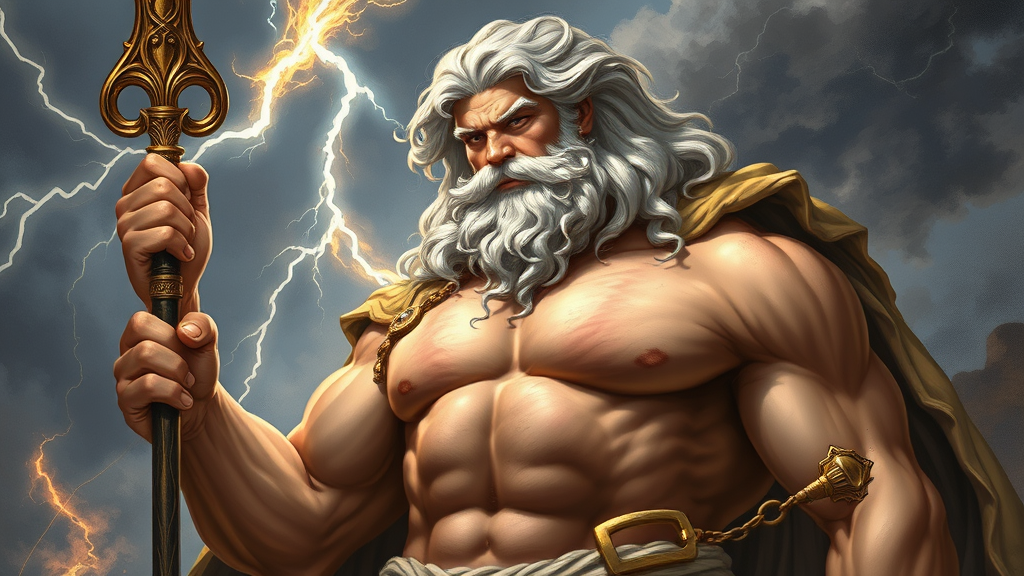 A portrait of Zeus, the god of thunder, holding a lightning cane in one hand, showcasing his muscular build. This fantasy illustration is intricately designed and elegantly detailed, drawing inspiration from digital painting techniques. The style is reminiscent of the art from Gaston Bussiere and Alphonse Mucha's era, with a focus on smooth execution and sharp focus. Despite being a digital concept art, it maintains an illustrative charm, capturing the essence of Zeus in a majestic and powerful demeanor. The painting achieves a balance of realism and fantasy, ensuring Zeus is depicted with an aura of divine strength and authority.