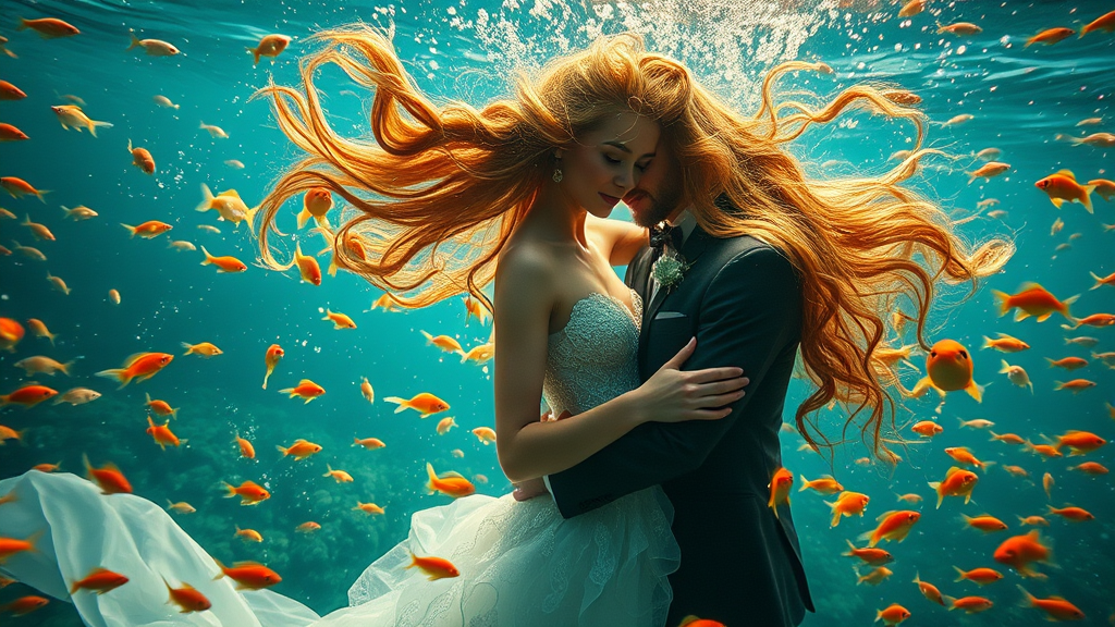 A portrait photo captures a stunning mermaid bride holding her groom tenderly amidst a dreamy underwater scene. Her luxurious, flowing hair dances amidst a flurry of small goldfish and vibrant marine life. The serene underwater wedding ceremony is bathed in a delicate light filtering softly through the water. Shot with a cinematic, 35mm lens at F/2.8, the image features a vignette and cinematic lighting, revealing an insanely detailed, intricate, and ornate scene. The composition showcases elegance and super detailed artistry, enveloped in a captivating 4k underwater spotlight ambiance.