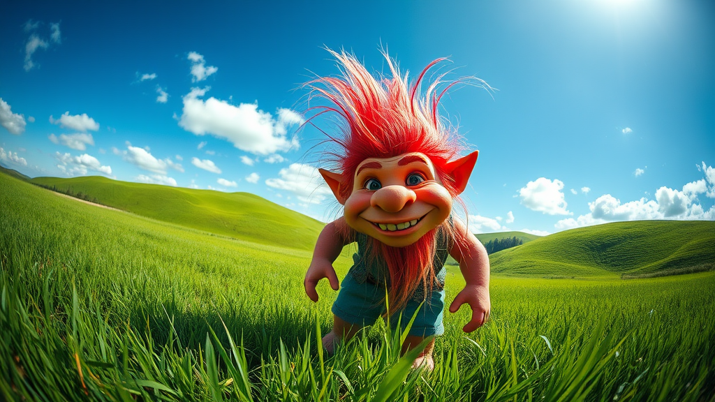 A portrait photo capturing a whimsical troll with exaggerated features, standing in a lush grassy meadow under the expansive sky, with rolling green hills in the background on a bright, sunny day. The scene bursts with vibrant and vivid colors, emphasizing the unique perspective provided by the fisheye lens, adding an enchanting and surreal twist to the landscape.
