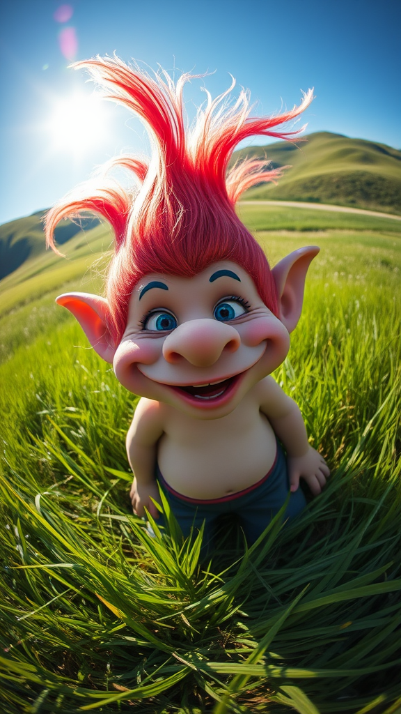 A portrait photo of a whimsical troll enjoying the sunshine in a lush, grassy landscape, with gentle hills rolling in the background, captured through a fisheye lens to emphasize the creature's playful features and the vivid, vibrant colors of the scene.