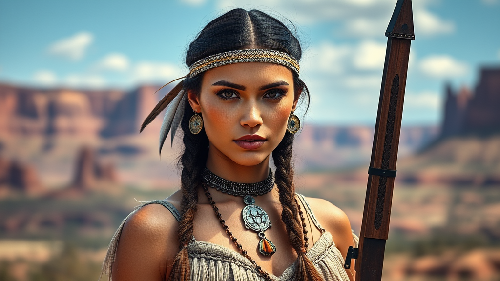 A portrait photograph inspired by Madison Beer as a modern interpretation of Pocahontas, featuring a young, beautiful woman with Native American heritage, showcasing a perfectly symmetrical face adorned with feather jewelry and wearing a traditional handmade dress. She embodies the spirit of an armed female hunter warrior, set against the stunning Utah landscape. The image is ultra-realistic concept art that highlights elegance and depth of field, providing a rich visual experience.