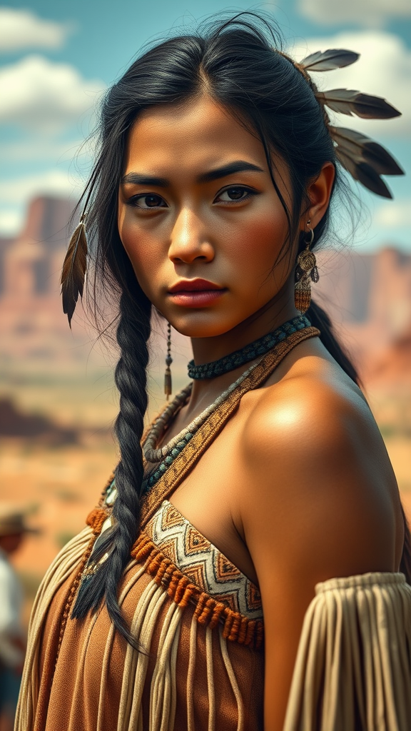A portrait photograph inspired by the essence of Pocahontas, featuring a young, beautiful Native American woman with a perfectly symmetrical face. She is adorned with feather jewelry and wears a traditional handmade dress, embodying the spirit of an armed female hunter warrior. The environment captures the stunning Utah landscape, depicted in ultra-realistic concept art with an elegant touch and a remarkable depth of field. The image is envisioned in high-resolution, showcasing a pristine portrait free from imperfections like text, error, missing or extra digits, and other artistic flaws. The portrayal avoids elements like poorly drawn features, distortions, or blemishes, offering a clear, captivating, and harmonious representation without intruding artifacts or distracting watermarks.