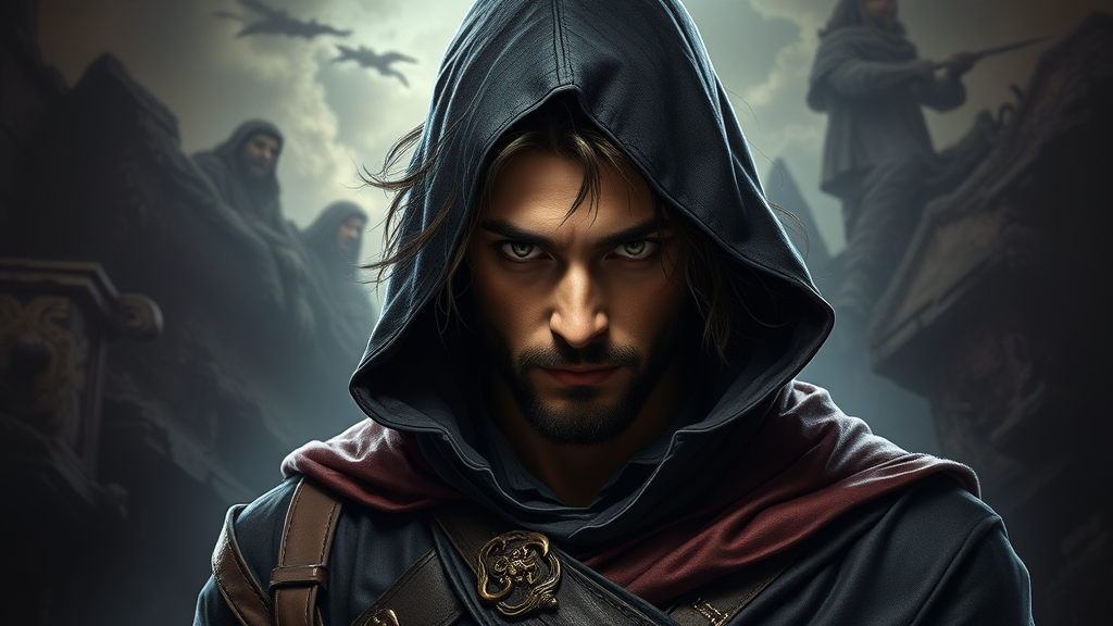 A portrait photograph of a male rogue character, featuring intricate details and capturing an award-winning essence, high resolution 16k quality, a masterpiece showcasing a full body reference sheet suitable for RPG and fantasy settings, with perfectly symmetrical features, inspired by Dungeons and Dragons themes, including subtle creative elements such as an enigmatic expression, a dynamic pose, and a rich background illustrating a fantastical landscape with shadowy tones.