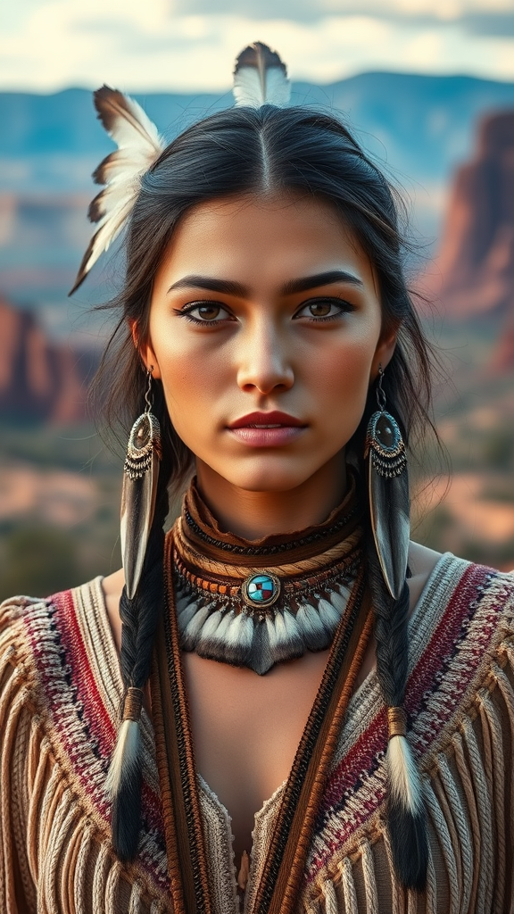 A portrait photograph of a young, beautiful Native American woman resembling Madison Beer, with a perfect symmetrical face adorned with feather jewelry. She wears a traditional handmade dress, embodying the essence of an armed female hunter warrior. The background features the stunning Utah landscape, creating an ultra-realistic environment. Concept art elevates her elegance, with a depth of field highlighting her presence. This high-quality image captures the rich cultural heritage and strength of this elegant figure.