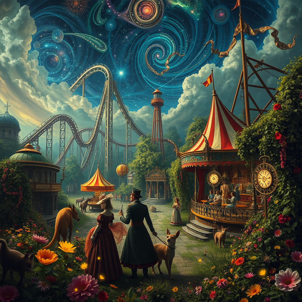 A post-apocalyptic carnival set in a lush overgrown amusement park, where decaying roller coasters are intertwined with vibrant vines and colorful blooming flowers, under an electric sky filled with swirling galaxies, circus performers with steampunk attire and mechanized limbs entertain anthropomorphic animals dressed in Victorian garb, fireflies glowing with iridescent hues dance around the scene, the entire composition reminiscent of Hieronymus Bosch meets Hayao Miyazaki, encapsulating themes of resilience and the beauty of nature reclaiming man-made structures.