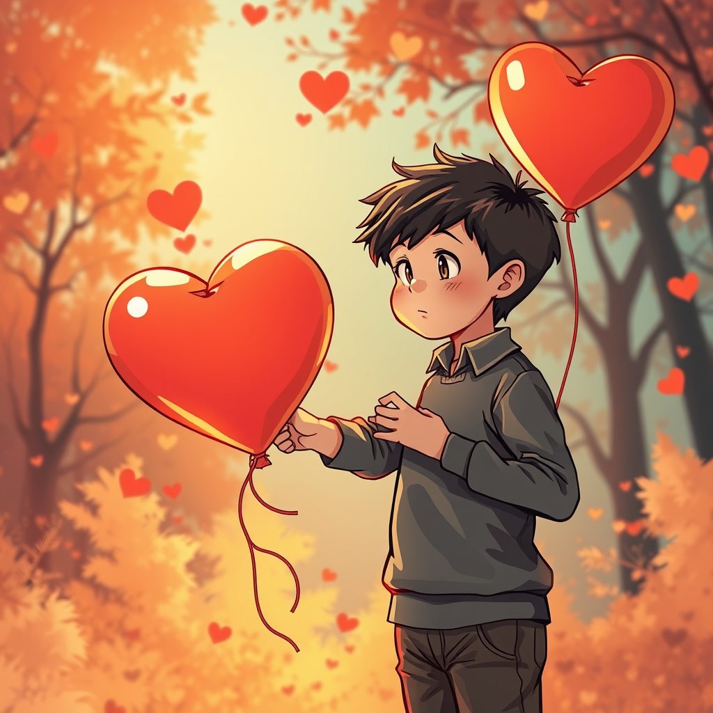 A poster features a young boy grasping a heart-shaped balloon, crafted in the style of Sketchfab with a twist of Poodlepunk, enveloped in warm, inviting tones. The scene resonates with a #screenshotsaturday vibe, presenting romanticized figures within expressive comic panel aesthetics. The moment captures the essence of romantic academia, utilizing hdr techniques to enhance depth. The boy strikes a dynamic pose, surrounded by the pin-sharp focus of a 32k resolution illustration, offering a playful yet sophisticated interpretation of the original concept.