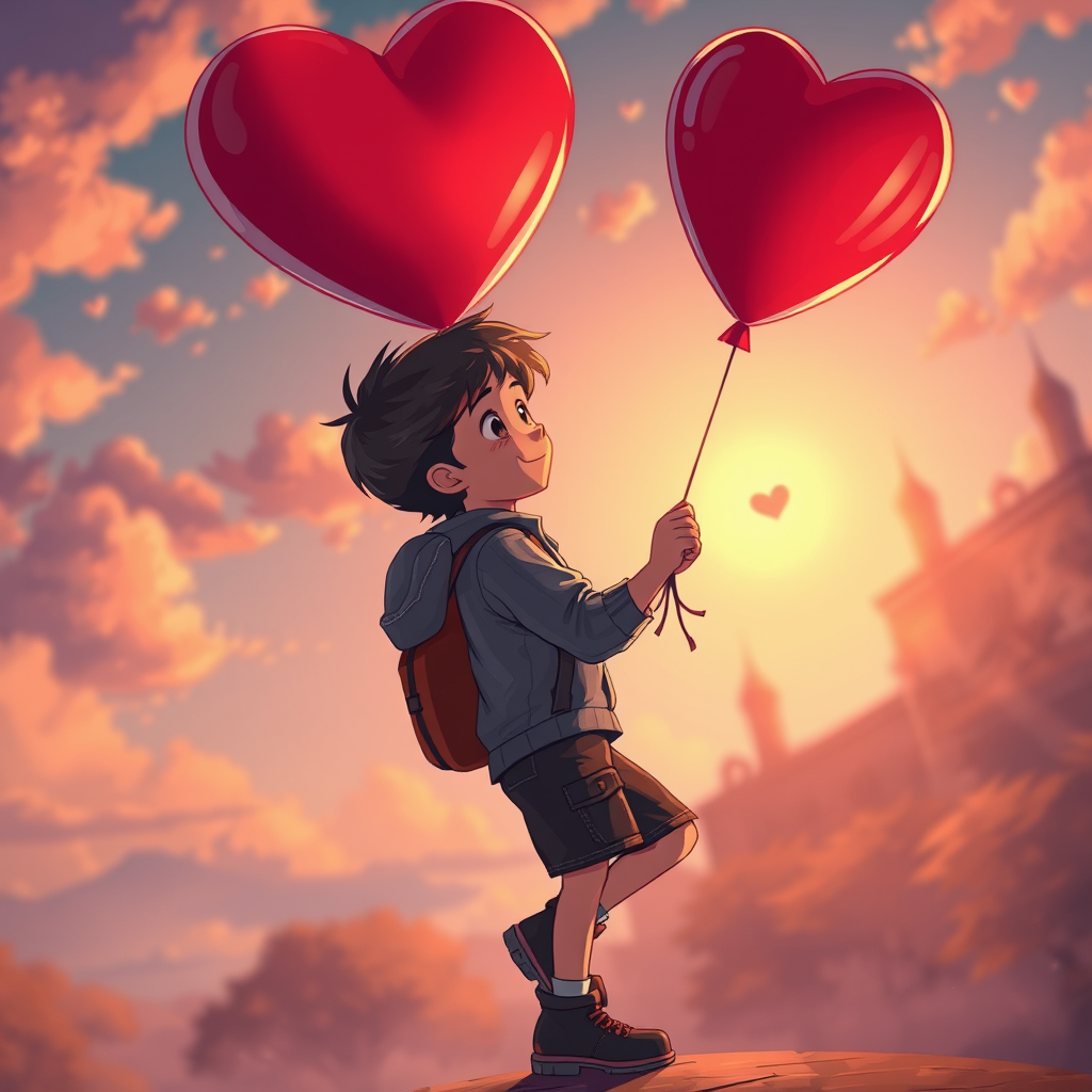 A poster features a young boy grasping a heart-shaped balloon, rendered in a Sketchfab-inspired style with a poodlepunk twist. The scene is bathed in warm, inviting tones reminiscent of #screenshotsaturday, where romanticized figures and expressive comic panels merge seamlessly. The atmosphere captures the essence of romantic academia with HDR effects, enriched by a dynamic pose that enhances the storyline, all in ultra-high 32k resolution. The illustration maintains a sharp focus, highlighting intricate details and evoking a sense of youthful wonder and adventure.