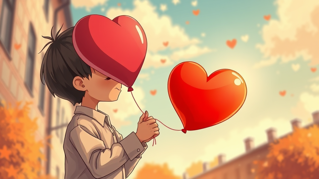 A poster illustrates a young boy gripping a heart-shaped balloon, captured in the artistic style of sketchfab and poodlepunk with warm, inviting tones. The scene mirrors the vibrancy of #screenshotsaturday with romanticized figures and expressive comic panels. Set in the realm of romantic academia, the image boasts an hdr effect, showcasing a dynamic pose in sharp focus. The 32k resolution accentuates every detail in this illustration, blending whimsy and depth for a captivating visual storytelling experience.