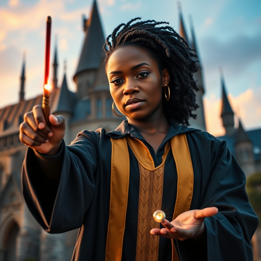 A powerful 30-year-old African American woman stands confidently in front of the iconic Hogwarts School of Witchcraft and Wizardry. Clad in a sleek black and gold Hogwarts robe, she practices the Dark Arts with her wand, which glows with vibrant magical energy. Her expression is one of intense focus and determination as she casts her spell to prepare for an impending threat. The scene captures the majestic Hogwarts castle under the warm embrace of the golden hour, adding a magical ambiance with hints of blue and purple hues in the sky. Her wand movements are precise and elegant, a testament to years of dedicated practice. The cinematic capture, evocative of a Ryan Coogler film, showcases her unwavering passion and courage, ready to defend her students. The castle stands tall and impressive in the background, embodying the rich history and tradition of the wizarding world.