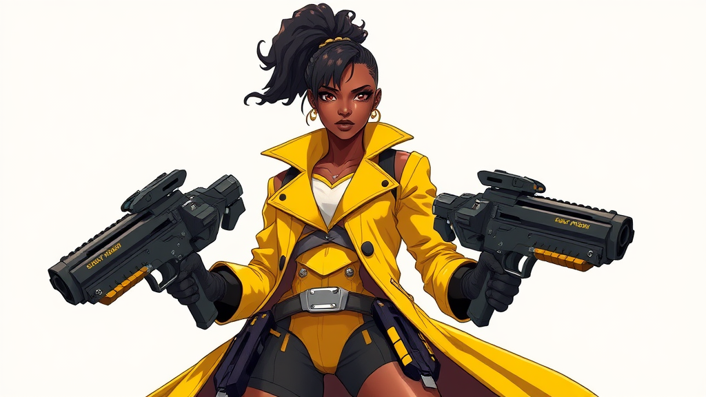 A powerful and dynamic female character with an afrofuturism anime flair, she wears a striking yellow coat and carries dual high-tech guns. Inspired by the styles of Overwatch and Apex Legends, her design blends the elegance and agility of Loba Andrade with the robust strength of Brigitte, and she carries the spirit of Lucio as a woman. Her presence is commanding, reminiscent of Senna from League of Legends and a Valorant agent, bringing a unique blend of futuristic tech and stylish flair in her character concept.