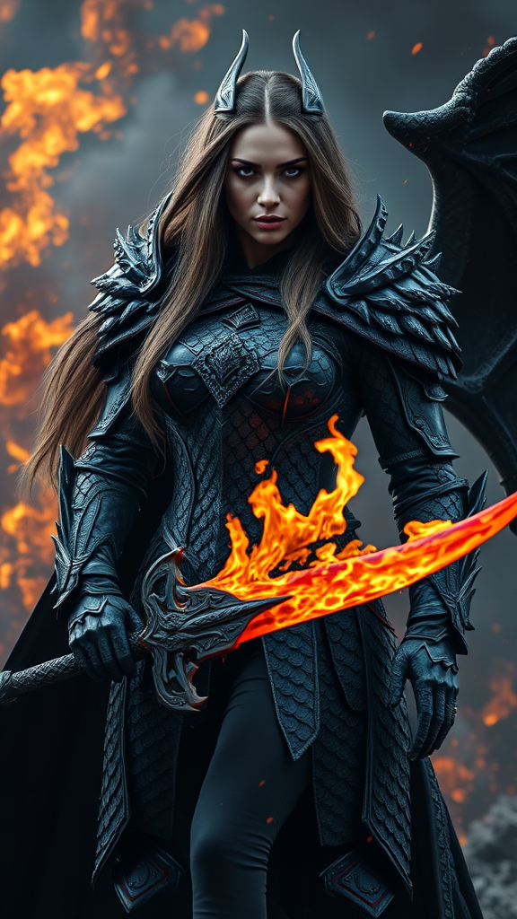 A powerful and realistic woman clad in ominous black dragon-inspired armor stands with commanding presence, holding a blazing fire sword in her grip. Her long, flowing hair contrasts starkly against her intricate, fearsome armor. Her face is a masterpiece of human realism, detailed with striking features and intense expression. The character is rendered with extraordinary attention to detail, from the intricacies of her armor's scaled design to the super detailed, sharp-focus depiction of her face. She stands in a dynamic, epic pose that exudes strength and mystery, set against a dramatic backdrop of swirling fire and ash. The scene is vividly captured in ultra-high resolution, evoking a sense of horror and awe, while ensuring every element resonates with visual impact.