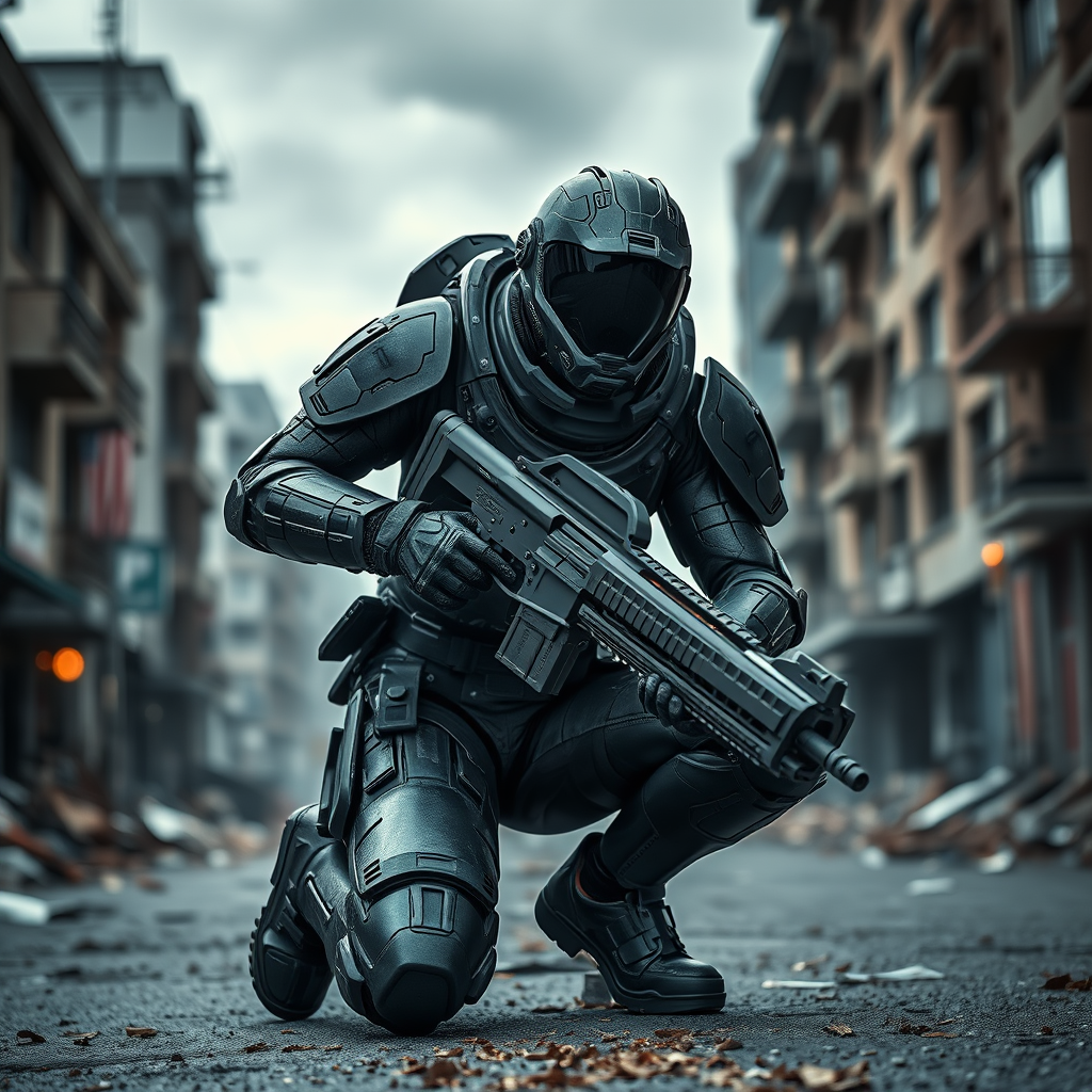A powerful black female figure in futuristic battle armor crouches on one knee, clad in an intricate cybernetic helmet with a sleek visor, and a bald head. The scene captures her with a weapon at the ready, showcasing her resilient pose amidst an urban battlefield. Her plate armor seamlessly intertwines with insulated parts of a spacesuit, exuding a sense of strength and agility. The intricate details of her armor reflect a science fiction movie aesthetic, set against a backdrop of a ruined city street. The overcast sky casts a soft, moody ambient light that enhances the natural textures and depth in the image. The photorealistic quality is elevated through cinematic rendering, utilizing ray tracing to create a captivating, high-detail portrayal. The third-person view is complemented by a cinematic blur effect, with a long exposure that enhances the dynamic pose. Shot in 8K Ultra-HD, the natural and moody lighting infuses the scene with a lifelike, immersive atmosphere.