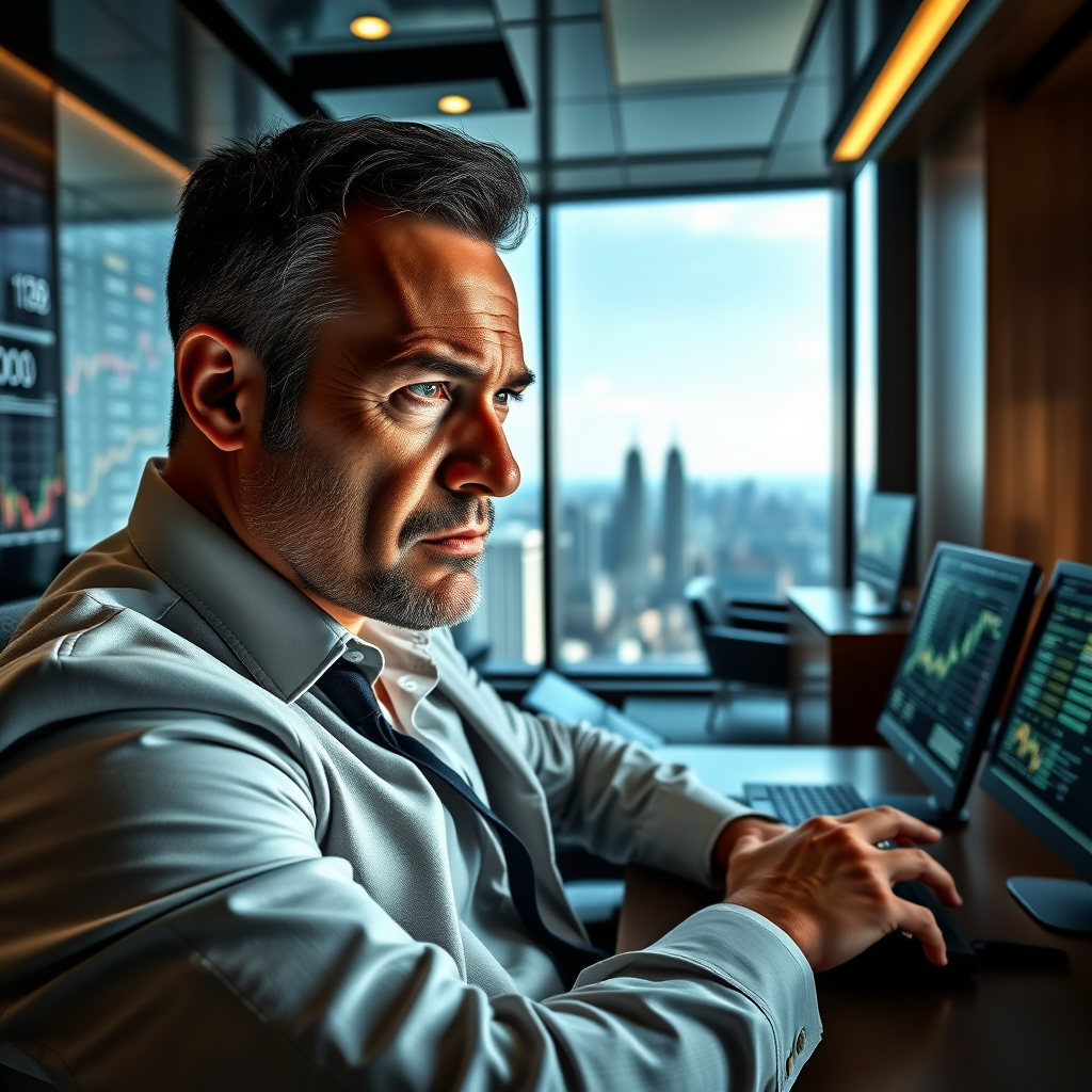 A powerful businessman with a commanding presence sits in a sleek, modern office, his face chiseled and commanding under dramatic lighting, emphasizing his intense expression. His deep-set eyes, filled with determination and a hint of ruthlessness, scan an array of glowing digital screens filled with complex financial data and strategic plans. The office, a luxurious blend of dark wood and polished steel, reflects his taste for power and sophistication, while the view of the sprawling cityscape through the floor-to-ceiling windows suggests his vast influence. His posture is relaxed yet purposeful, suggesting a man used to wielding immense power and executing decisive, game-changing strategies.