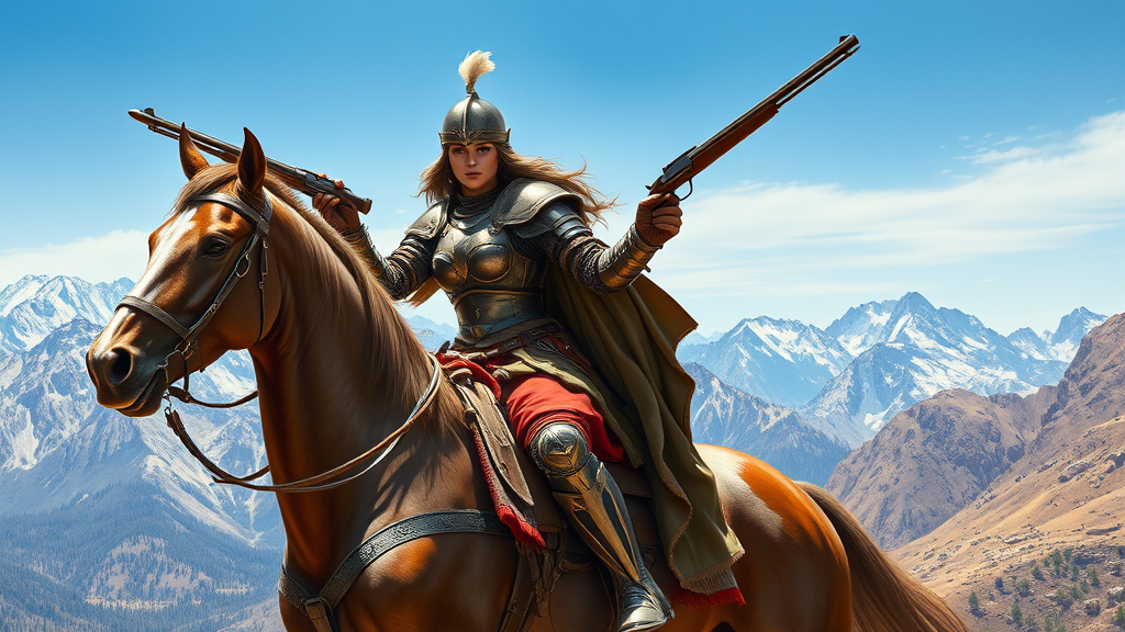 A powerful depiction of a female warrior clad in intricately detailed medieval armor, mounted confidently on a majestic horse. Her presence blends the fierce spirit of a knight with the rugged charm of a cowboy. She wields a gleaming flintlock pistol with one hand, while the other grips a finely crafted rifle. The scene is set against a breathtaking backdrop of towering mountains under expansive blue skies. The image is captured with stunning high resolution and hyper realism, reminiscent of an oil painting by Frank Frazetta, exuding a sense of dynamic energy and timeless heroism.