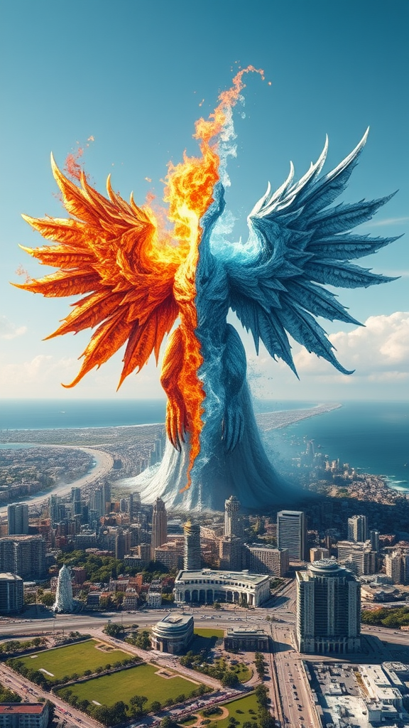 A powerful elemental sentinel towers over a city, its majestic form a testament to the forces of creation and destruction. One side of the creature emanates fierce, untamed flames, while its opposite half is shrouded in a protective armor of unyielding ice. This guardian stands with formidable wings spread wide, casting an imposing shadow over a metropolis caught between blazing fire and a stark, frozen wasteland. The scene reflects the eternal struggle between searing heat and biting cold. Amidst such elemental chaos, the city beneath thrives in an unexpected calm: human life bustles with activity, the skies remain serene and cloudless, and the ocean's gentle sway kisses green, untouched landscapes. Under the warm embrace of direct sunlight, colorful flowers bloom and ordinary wildlife meander undisturbed. The city buildings stand unaffected, showcasing functional technology and daily routines unbroken by the elemental duel above. Though the creature's elemental energies are asymmetrically distributed, with one side ablaze and the other frozen, harmony is somehow maintained in this extraordinary balance of powers.