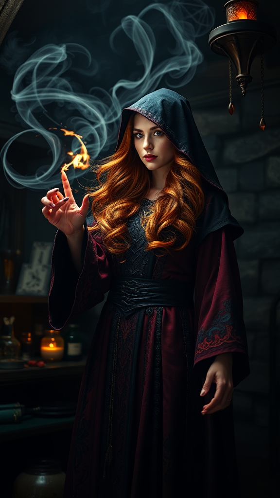 A powerful enchantress with flowing auburn hair dons a dark cowl and intricately designed robes of crimson and ebony, casting a spell amidst swirling arcs of magical energy. The scene is steeped in a dramatic atmosphere with dim, moody lighting that casts an ethereal glow, as arcane symbols float mysteriously in the air. She stands in a mystical laboratory filled with ancient artifacts and bubbling potions, showcasing extreme detail in every nook and cranny. The composition captures a backlit, cinematic low-angle shot, set to an ultra-high definition resolution with HDR quality, emphasizing fantastical elements and an air of enchanting mystery.