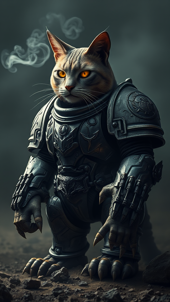 A powerful feline figure in intricately detailed power armor, reminiscent of the Adeptus Astartes from Warhammer 40k, stands amidst a desolate battlefield. The darkened tones of the scene are pierced by dramatic, cinematic lighting that highlights the textures and engravings on the hyper-realistic armor. The cat's eyes glint with intelligence and strategy, exuding an aura of commanding presence. Smoke and shadows swirl around, adding depth and intensity to the atmosphere, while small ethereal energy wisps flicker around its paws, hinting at ancient and mysterious powers.