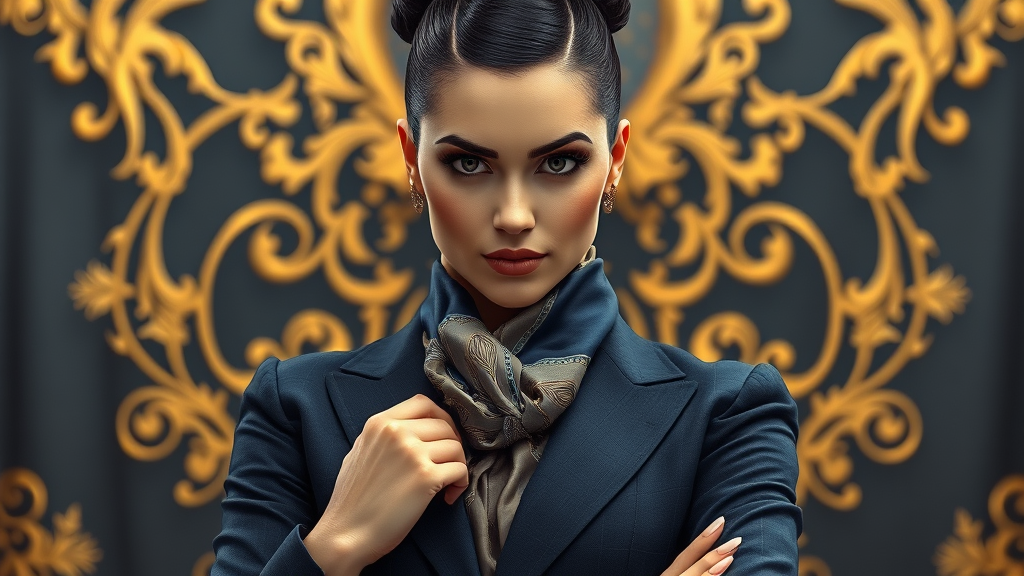 A powerful female business executive commands attention in her tailored navy pantsuit, accentuated by a luxurious silk scarf and a meticulously styled sleek bun. Her piercing gaze is captured in striking detail, while gold leaf and metallic highlights enrich the depth and texture of the hyper-maximalist composition. This breathtaking, grandiose artwork merges the elegance of Art Deco and Art Nouveau with a modern flair, celebrating contemporary femininity and empowerment. The scene is meticulously crafted using CGI and 3D rendering techniques, avoiding imperfections and emphasizing realistic anatomy, balanced proportions, and graceful hands and features.