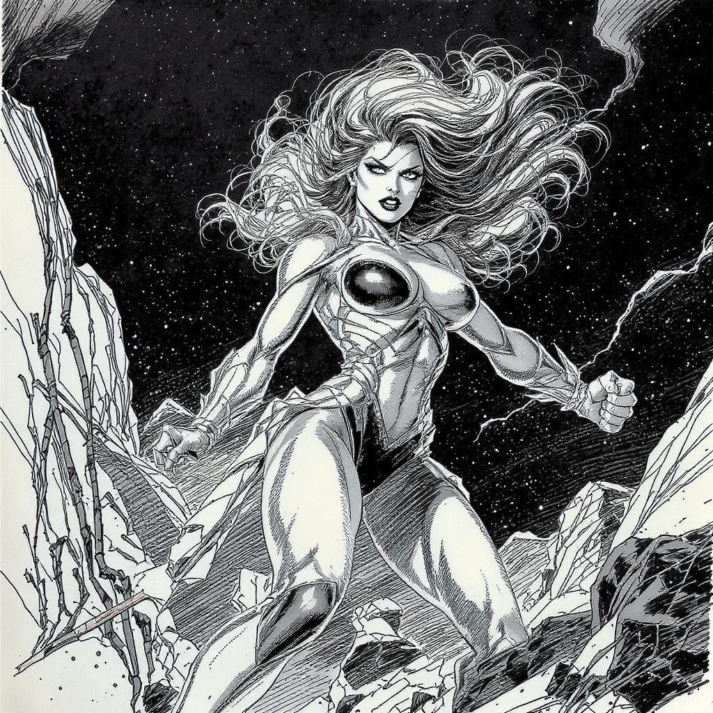 A powerful female character in 90s Top Cow comic book style, striking a dynamic and energetic pose with expressive inked line art. The illustration showcases intricate shadows and robust contrasts, capturing intense action and vibrant energy. Her detailed costume is meticulously designed, reflecting the high-quality and high-res ultra-detailed aesthetics characteristic of comic book art. The scene is infused with intense lighting, highlighting her well-defined physique and movement. This depiction maintains the essence of the 90s style, emphasizing exaggerated anatomy and dramatic flair, with each element contributing to the overall high-impact visual narrative.