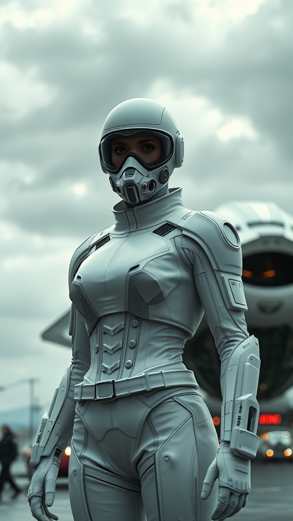 A powerful female figure clad in a sleek white sci-fi spacesuit stands confidently on a bustling spaceport. Behind her looms a futuristic spacecraft, its design both intimidating and awe-inspiring. The sky overhead is an ominous overcast, lending an air of intense anticipation to the scene. Her face is obscured by a sophisticated sci-fi mask and visor, complemented by intricate lenses and a high-tech respirator. Her bald head gleams under the moody lighting, adding to her enigmatic presence. The suit is a hybrid of elegant plate armor and isolated components, seamlessly blending protection with mobility. Captured from a dramatic low-angle perspective, the shot highlights the character's imposing stature and the meticulous detail etched into her ensemble. The image captures the essence of a sci-fi blockbuster, infused with natural textures and lighting that amplify its lifelike quality. Employing techniques like cinematic rendering and ray tracing, the scene is a masterclass in photorealism, with ambient blur and strategic long exposure enhancing its dynamic essence. The portrayal is a visually stunning blend of cinematic lighting and high-definition detail, achieving an unparalleled level of realism in 8K Ultra-HD resolution.