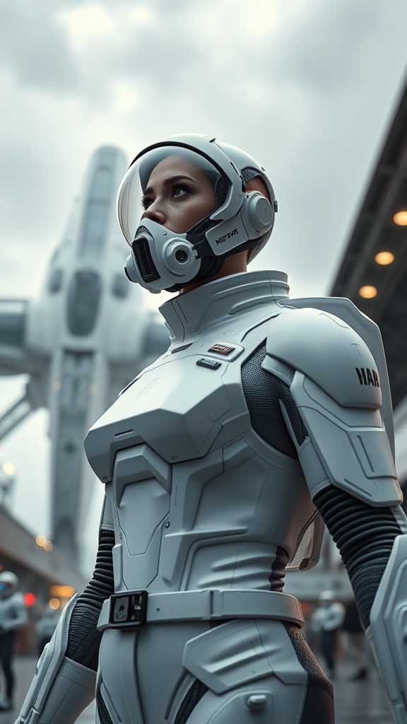 A powerful female figure clad in a sleek white sci-fi spacesuit stands confidently in a bustling spaceport, with a cutting-edge spaceship looming majestically in the backdrop. An overcast sky casts a dramatic atmosphere as she surveys her surroundings through a high-tech sci-fi visor that integrates a sophisticated lens system. Her head is bald, exuding a sense of readiness and determination, while a state-of-the-art respirator enhances her otherworldly presence. Her ensemble includes intricately detailed plate armor and isolated armor pieces that speak to advanced technology and craftsmanship. Viewed from a low-angle third-person perspective, the scene captures her imposing stature with an abundance of fine detail reminiscent of a blockbuster sci-fi movie. The environment is rich with natural textures and is illuminated by ambient light, bringing an element of realism. The photograph boasts superb photorealism, employing cinematic rendering and ray tracing techniques to achieve the highest quality and detail. The moody and cinematic lighting, combined with a subtle blur effect and long exposure, enhances the atmospheric depth. This 8K Ultra-HD image immerses the viewer in a detailed and futuristic narrative.