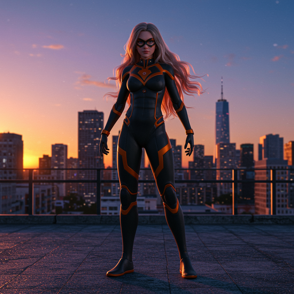 A powerful female superhero stands confidently in a sprawling big cityscape at dusk. Her long, wavy hair cascades around her, catching the vibrant hues of the setting sun. Dressed in a sleek black and orange suit that accentuates her form, she exudes strength and agility. Her dynamic pose suggests readiness and determination, while the cinematic style of Studio Trigger, Makoto Shinkai, and Studio Ghibli brings an anime flair to the scene. The volumetric lighting creates a dramatic atmosphere with soft shadows that enhance the overall high-quality, 8k presentation. The scene is vividly detailed, capturing the essence of an epic, cinematic moment without distractions, such as weapons or additional props. The art is clean and precise, focused on showcasing her as the centerpiece amidst a backdrop that highlights the beauty and hustle of the city.