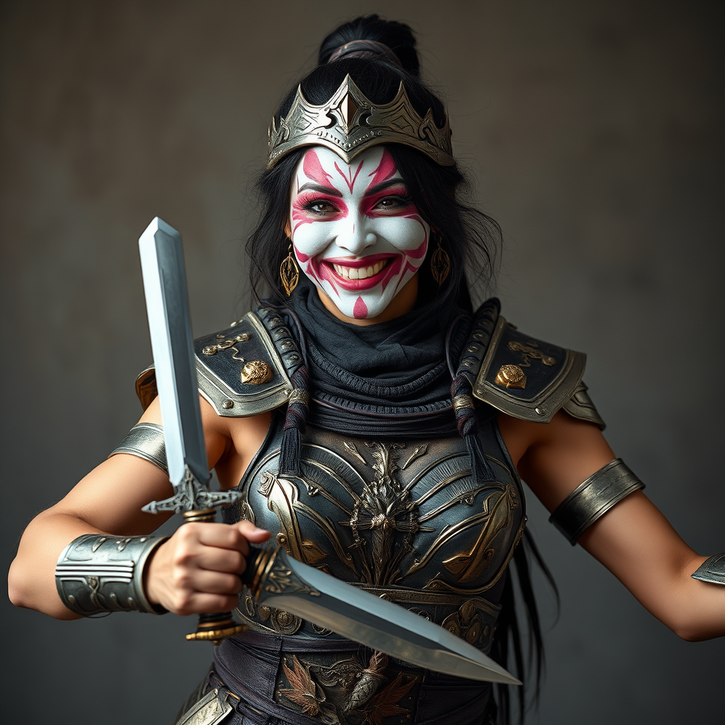 A powerful female warrior adorned in realistic, intricately designed armor, featuring a blend of gold and silver elements, proudly displays her strong, uncovered arms. She brandishes a finely crafted knife, exuding confidence. Her face is painted in an elaborate mime style with playful hues of pink and white, enhancing her expressive features. With a joyous smile and infectious laughter, she exudes an aura of strength and vivacity. The setting captures a balance of elegance and fierceness without any hint of cosplay, maintaining the essence of authenticity.