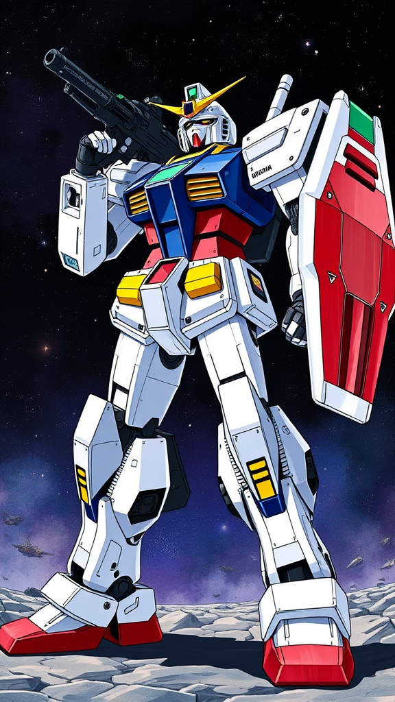 A powerful illustration featuring the iconic RX-78-2 Gundam, showcasing its dynamic pose and intricate design in the distinctive style of Kunio Okawara. The Gundam stands tall, wielding its beam rifle with precision and holding its robust shield confidently, embodying the essence of Mobile Suit Gundam. The robot's outer armor gleams with a careful balance of whites, blues, reds, and yellows, emphasizing its heroic stature. The background hints at a cosmic battlefield, with distant stars peeking through the void, adding depth to the scene. Creative enhancements include additional detailing on the Gundam's joints and circuitry, and a stylized reinterpretation of its iconic helmet, maintaining the original spirit while introducing fresh elements.