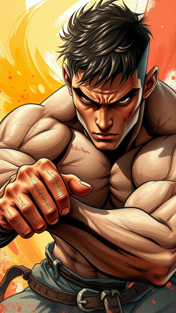 A powerful illustration of a rugged young man with cropped brown hair and an intense, determined gaze. His well-defined muscles and calloused hands hint at a life of relentless training, while scars and battle marks across his face and body speak to his experience as a seasoned fighter. He is portrayed in a dynamic, action-packed pose, as if caught in the heat of battle. The style is reminiscent of Prokoko, featuring bold, sweeping brushstrokes and a vibrant color palette that brings the scene to life. The background is an abstract blend of hues, adding to the intensity and drama of the moment.
