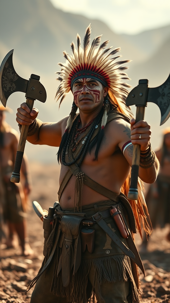 A powerful male Apache warrior stands fiercely in traditional war attire, his face painted with bold, intricate patterns that reflect his indomitable spirit. He brandishes two finely crafted axes with precision and agility, each one an extension of his battle-hardened form. His ornate warbonnet crowns his head, vibrant feathers cascading with the movement of the wind. The warrior's attire is an exquisite tapestry of Native Indian craftsmanship, rich in texture and detail, seamlessly blending into the battleground environment. Illuminated by dramatic natural light, his presence is captured in cinematic clarity, every shadow and highlight rendered with photorealistic precision. Subtle ray tracing enhances the scene, casting real shadows that dance across the rugged terrain. The focused depth of field draws the eye to his fierce expression and the intricate details of his armor. This high-definition portrayal leverages the capabilities of Unreal Engine 5, with cinematic rendering and 8K resolution capturing the warrior's stoic bravery amidst the tension of warfare, complete with VFX post-production magic for an immersive viewing experience.