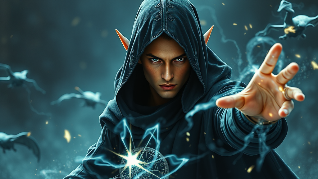 A powerful male elf casting an intricate spell, inspired by Dalamar The Dark from Dragonlance, wearing a sleek black hood. The elf wizard stands in a dynamic pose, exuding an aura of mystery amidst magical combat. His face is detailed with piercing eyes, exemplifying the pinnacle of photorealism. The scene captures the essence of a masterpiece, created with 8k resolution, and features artistic influences from Jeremy Mann, Sandra Chevrier, and Maciej Kuciara. The lighting and shadows are sharp and realistic, lending a 3D effect to the portrayal. Subtle modifications enhance the core concept without straying from the original inspiration.