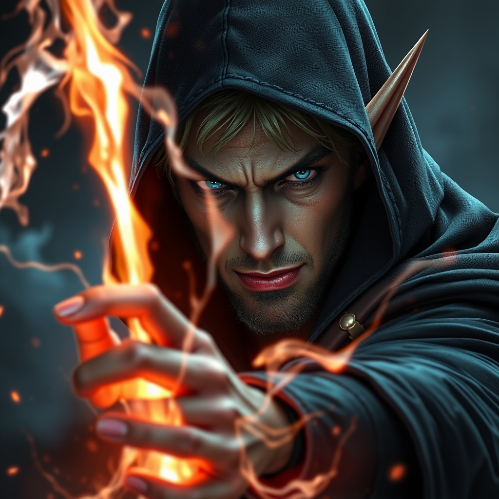 A powerful male elf engaged in magical combat, inspired by Dalamar The Dark from Dragonlance. He is casting a formidable spell, wearing a black hood, exuding an aura of mystery. This elf wizard is captured in action with a detailed, expressive face and mesmerizing eyes. The scene is a masterpiece, crafted in best quality 8k photorealism. The portrayal evokes the styles of Jeremy Mann, Sandra Chevrier, and Maciej Kuciara, emphasizing sharp realism with authentic shadows. The composition is 3D, delivering a lifelike presence without falling into low-resolution or fantastical anatomy, avoiding extraneous elements like multiple limbs, beards, or inappropriate attire.