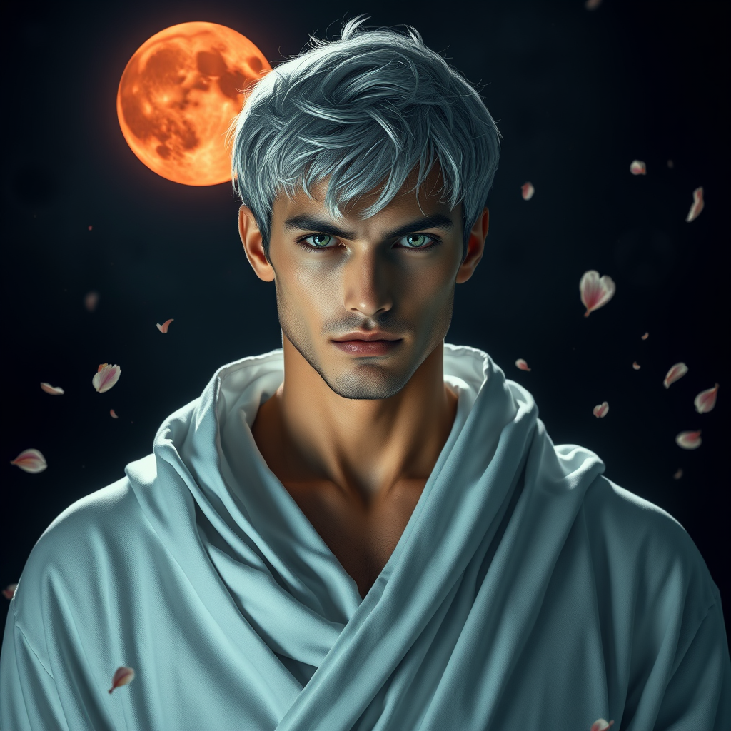 A powerful male figure with piercing green eyes and short silver hair stands confidently, draped in a pristine white robe. The scene is set under a haunting blood moon on a dark, mystical night. Delicate flower petals drift through the air, adding a surreal touch to the atmosphere. The portrait is captured from the front, with a dramatic side light casting soft shadows and the moonlight gently illuminating his form. The image is a masterpiece, captured with stunning clarity, akin to an 8K resolution.