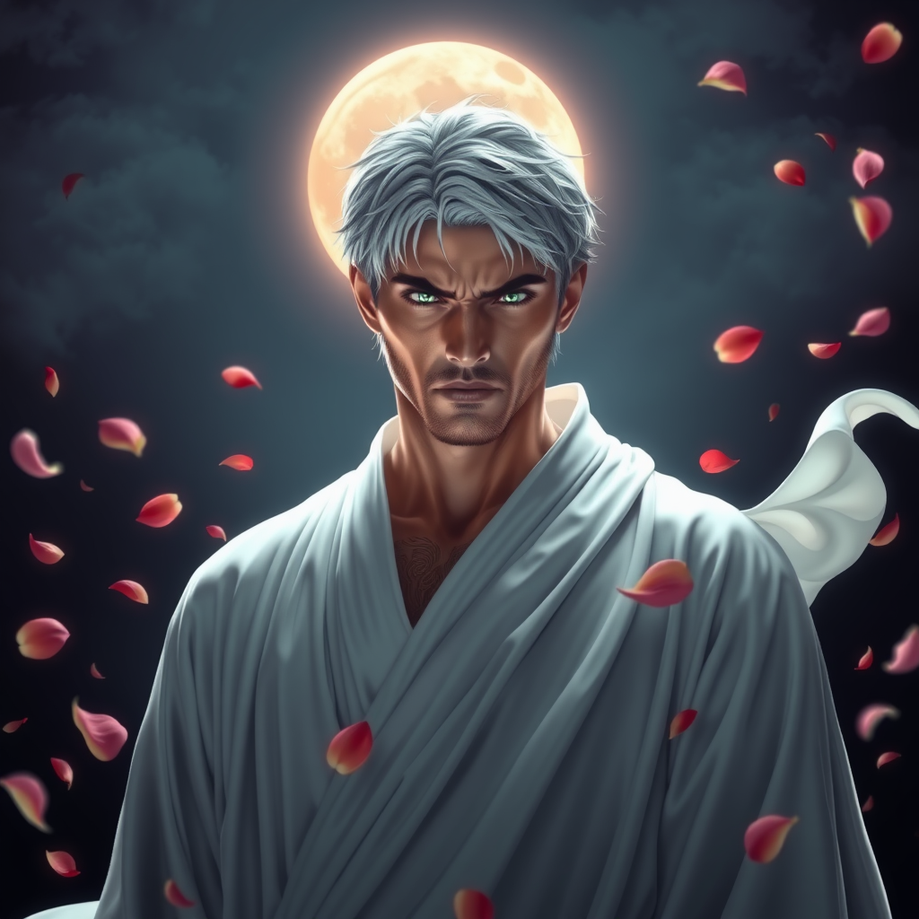 A powerful male figure with piercing green eyes and short silver hair stands in a flowing white robe under a dramatic blood moon night sky. Flower petals swirl elegantly around him, illuminated by soft side lighting. The moonlight casts a gentle glow on his strong features in this stunning front portrait shot, capturing a sense of mystery and strength. The scene is rendered in breathtaking 8K resolution, enhancing the richness of detail and atmosphere.