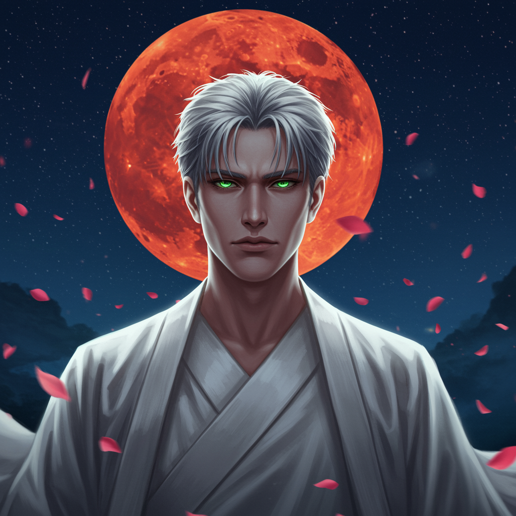 A powerful male figure with piercing green eyes and short, silvery hair stands enveloped in a flowing white robe. Against the backdrop of a blood-red moon on a clear night, flower petals drift gently through the air. In a front portrait shot, the scene captures the exquisite detail of side light illuminating his face, with moonlight casting an ethereal glow over him. The composition, shot with a shallow depth of field at f/1.8, emanates a sense of mystique and mastery, rendered in stunning 8K resolution.