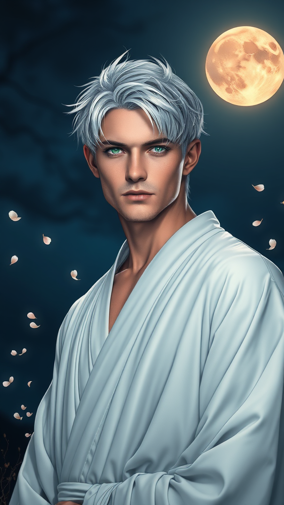 A powerful male figure with striking green eyes and short silver hair stands confidently. He is clad in a flowing white robe, accented by the soft glow of a blood moon overhead. The night sky serves as a dramatic backdrop, with delicate flower petals dancing in the breeze around him. The scene is captured in an exquisite front portrait shot, with a refined side light illuminating his face, highlighting his features. Moonlight bathes the figure in an ethereal sheen, adding an aura of mystery and elegance. The entire composition is rendered in stunning 8K resolution, creating a true masterpiece.