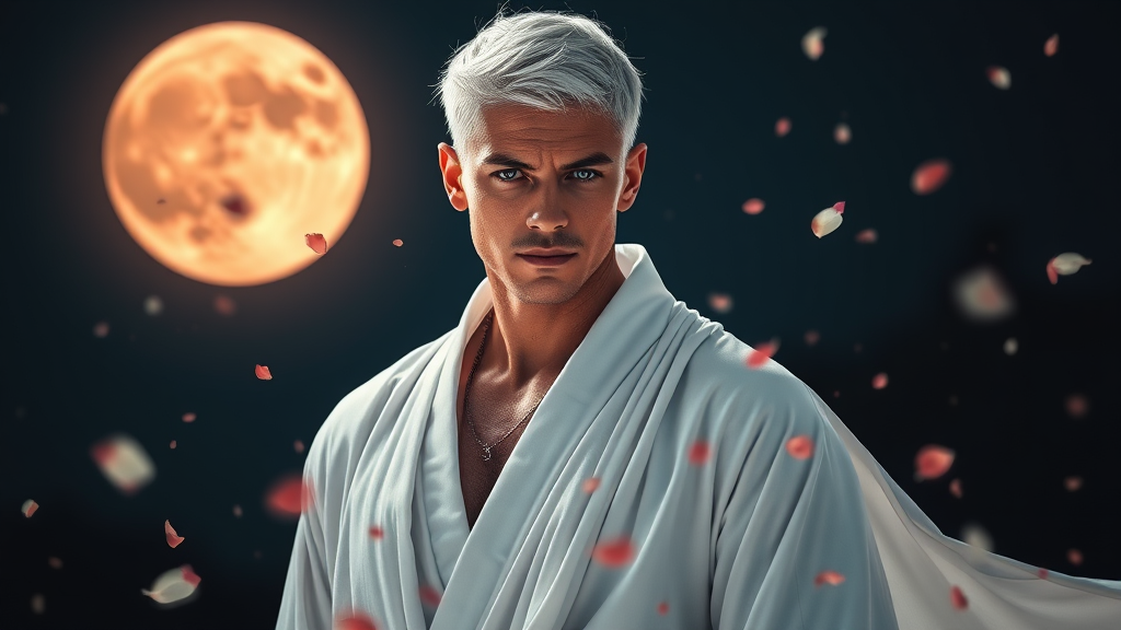 A powerful male figure with striking green eyes and short silver hair stands in a flowing white robe. He's captured in a front portrait shot with a shallow depth of field, f/1.8, against the backdrop of a blood moon night. Delicate flower petals drift around him, illuminated by soft side lighting as the moonlight casts an ethereal glow on his features. The scene is rendered in exquisite detail, capturing the surreal beauty of the moment in ultra-high definition 8K.