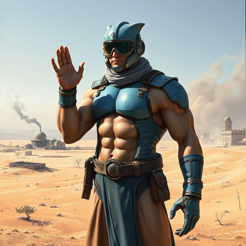 A powerful man clad in sleek blue body armor and intricate futuristic goggles stands firmly on the barren ground, his muscular physique highlighted in the harsh desert sunlight. He waves a hand towards an abandoned village on the horizon, smoke spiraling into the sky. His strong, sinewy form is reminiscent of the work of Boris Vallejo and Frank Frazetta, capturing their iconic blend of fantasy and realism. His head adorned with an advanced, sleek, robot-like headpiece, blending organic and technological lines. The scene exudes a sense of ominous mystery, with the art style echoing the grandeur and depth of Alex Ross's portrayals. The full figure composition emphasizes the character's commanding presence amidst the stark, desolate landscape.