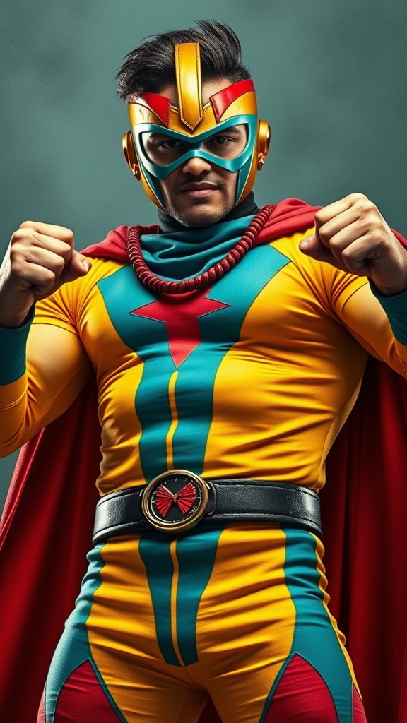 A powerful man stands poised like a superhero, adorned in vibrant Chicano art-inspired attire, his fists clenched with determination. The dark yellow and turquoise hues of his costume blend harmoniously with bold reds and bronzes, reminiscent of striking poster art. His appearance exudes rangercore spirit, with details captured through the vintage lens of an argus c3. The composition evokes the essence of the blue rider movement, embodying bold, expressive strokes and dynamic energy, set against a dramatic tall aspect ratio that heightens the sense of heroism.
