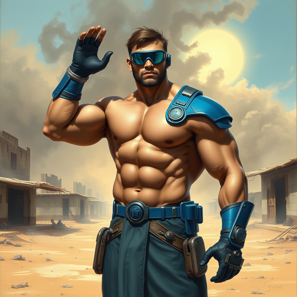 A powerful, muscular man clad in sleek blue body armor stands firmly on the sun-blasted grounds of an abandoned desert village, the air thick with swirling smoke. His futuristic goggles glint under the harsh sun, and a sophisticated, robot-like headpiece enhances his formidable presence. As he waves his muscular arm, his chiseled abs and fit physique are highlighted against the stark landscape. The scene is painted in the dramatic, dynamic style reminiscent of Boris Vallejo and Frank Frazetta, with a touch of Alex Ross’s crisp detail. The full portrait captures his commanding figure amidst the eerie silence of the deserted village, evoking an epic sense of mystery and strength.