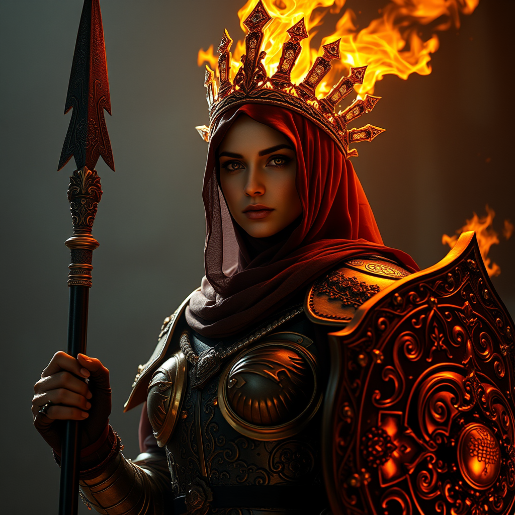 A powerful Muslim queen of fire stands regally, her silhouette adorned with a Hijab scarf and an extravagant crown of gold and diamond flames, shimmering against the dramatic lighting. Her eyes meet the camera with a gaze both fierce and wise. She is clad in intricately detailed armor, each piece a masterpiece of design that tells tales of forgotten battles. In her hand, she wields a spear, its shaft carved with mystic symbols, alongside a shield bearing intricate patterns of fire and light. The scene is captured with ultra-realistic precision, featuring the highest detail quality with a focus on subtle nuances, enveloped in cinematic lighting. The overcast reflection casting a soft glow, combined with focused depth of field and real shadow work, brings an unparalleled level of hyperrealism to the image. This stunning portrayal is enhanced by VFX post-production techniques, utilizing RTX ray tracing for dynamic light play, creating a movie-quality rendering that embodies strength and grace in vivid 8K resolution.